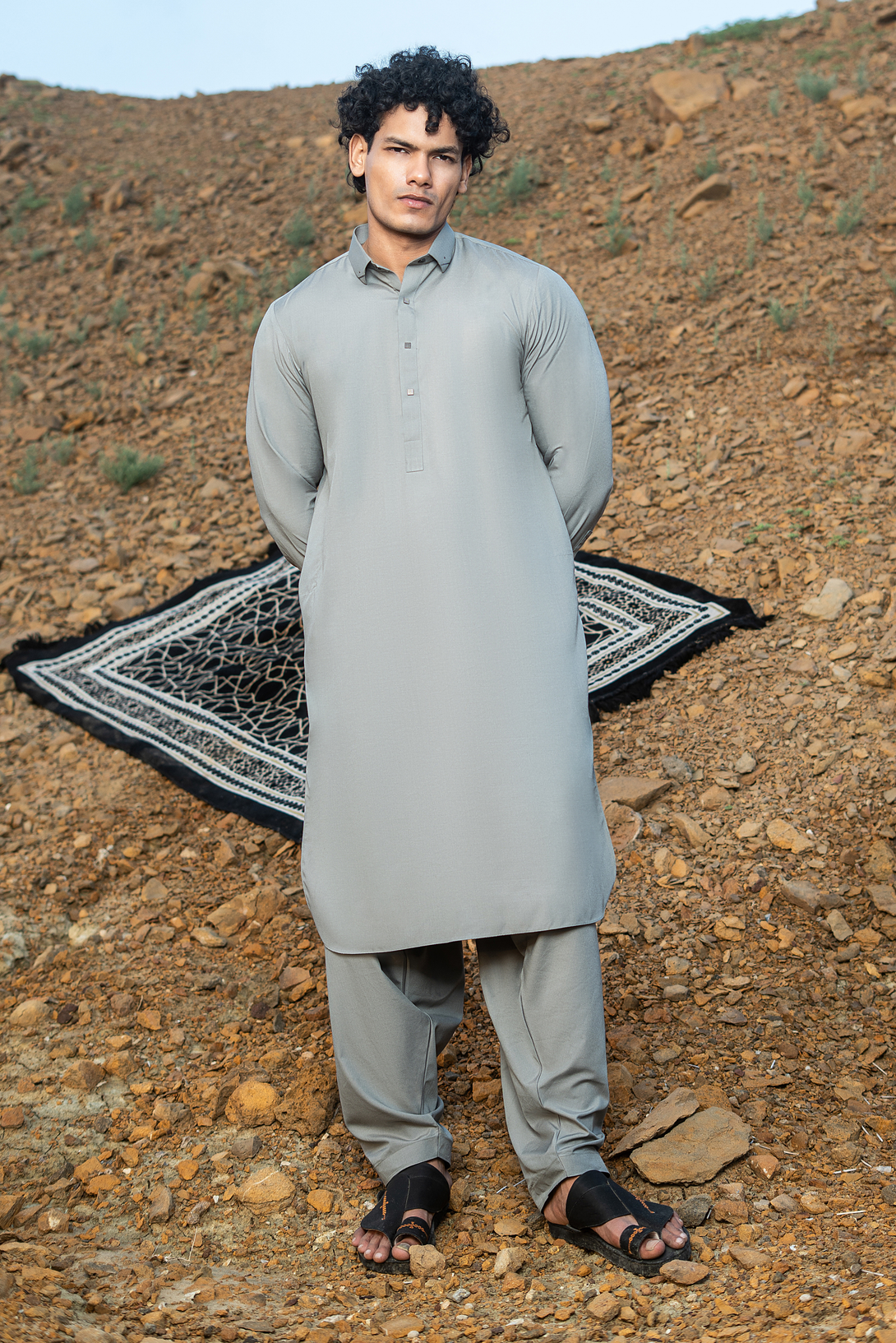 Redefine traditional elegance with our Grey Shalwar Kameez. Made from Premium Wash & Wear Boski Finish fabric, it combines luxurious texture, rich color, and masterful tailoring for a truly polished look.