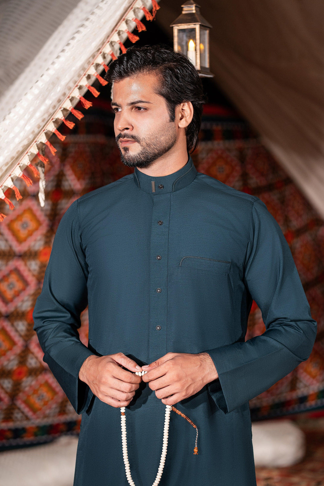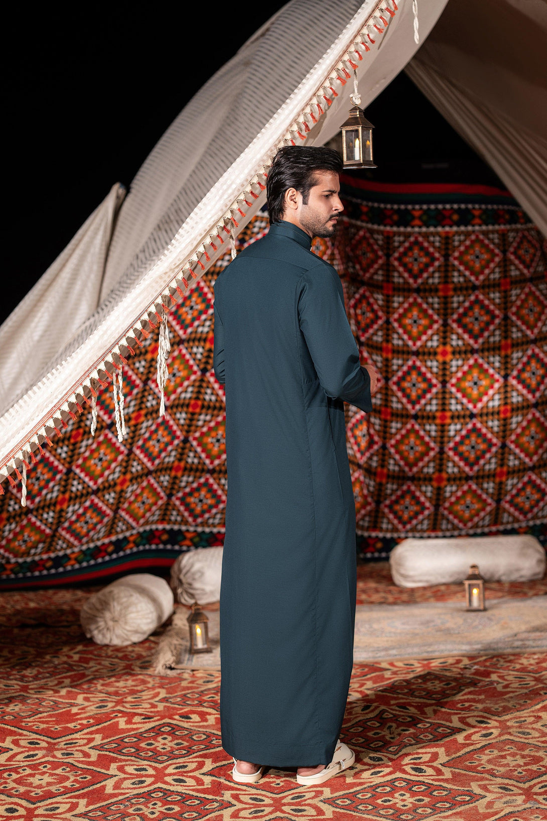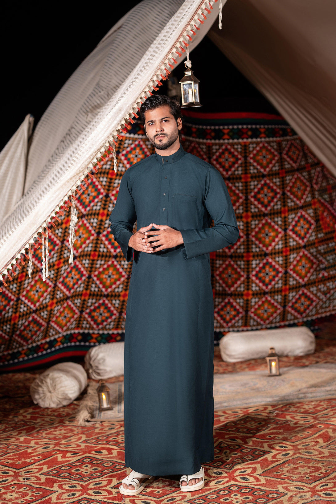 Experience refined sophistication with our Dark Emerald Green Round Collar Thobe. Crafted from Premium Wash & Wear Thai Boski Finish fabric. It features a classic round collar, elegant hems, and impeccable stitching. A timeless symbol of elegance and class.