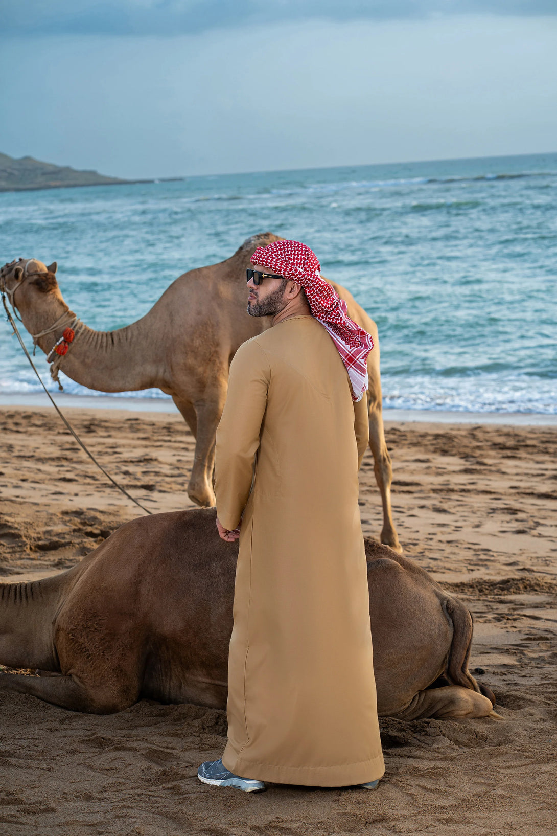Experience refined sophistication with our Camel Fawn Omani Kandura. Crafted from Premium Wash & Wear Ammonia Finish fabric. It features a classic signature Omani design, and impeccable stitching. A timeless expression of elegance and class.