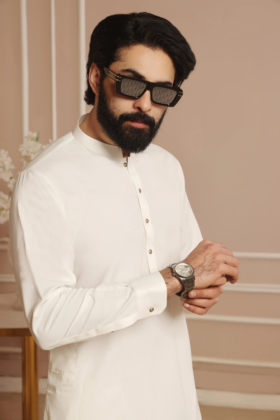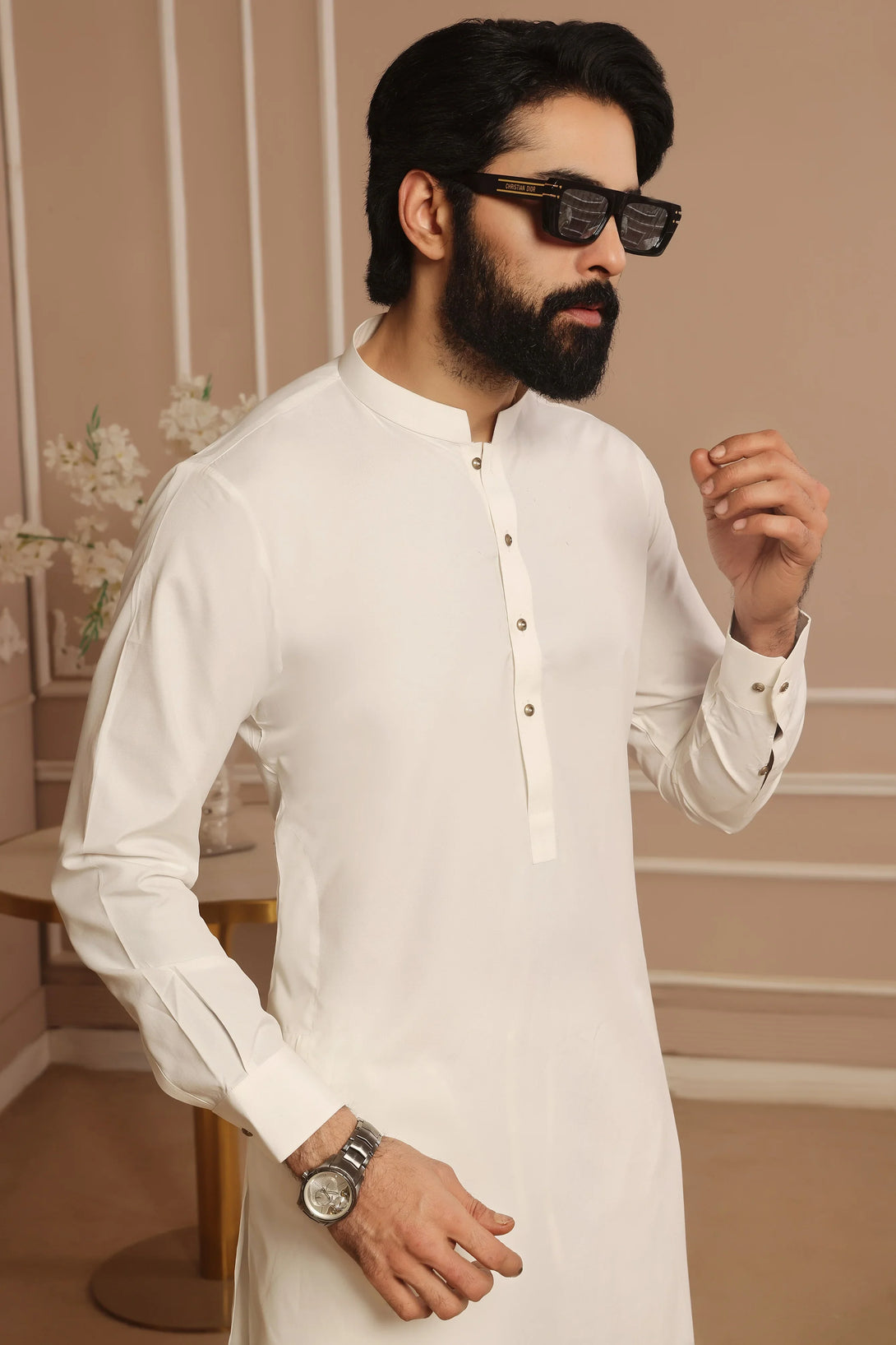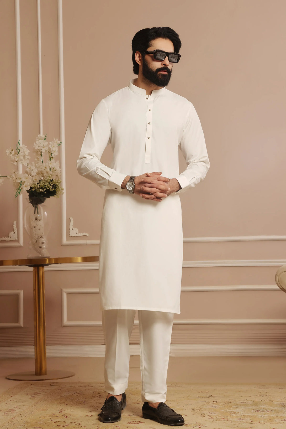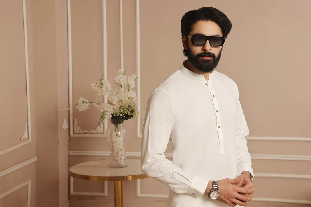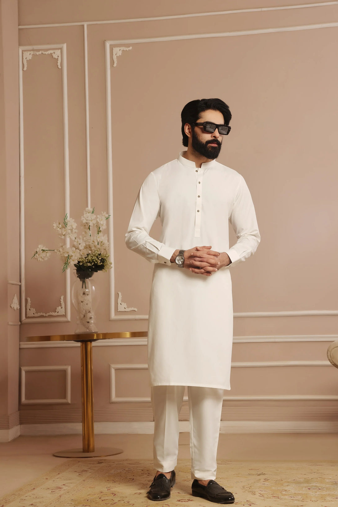 Immerse yourself in sophistication with our Off White Kurta Pajama. Crafted from Premium Wash & Wear Premium Suiting fabric for ultimate comfort and style. Featuring elegant button detailing and refined premium stitching, it offers a perfect balance of modern grace and traditional craftsmanship. Designed for the man who values effortless elegance.