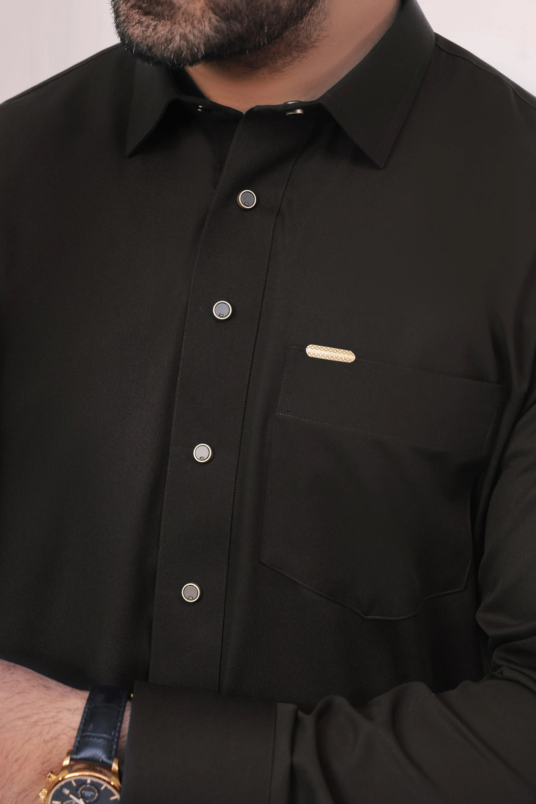 Exude sophistication with our Dark Chocolate Saudi Shirt-Collar Thobe. Crafted from premium Wash & Wear Suiting fabric and tailored with precise cuff detailing and elegant collar design, it embodies effortless class and refined craftsmanship.