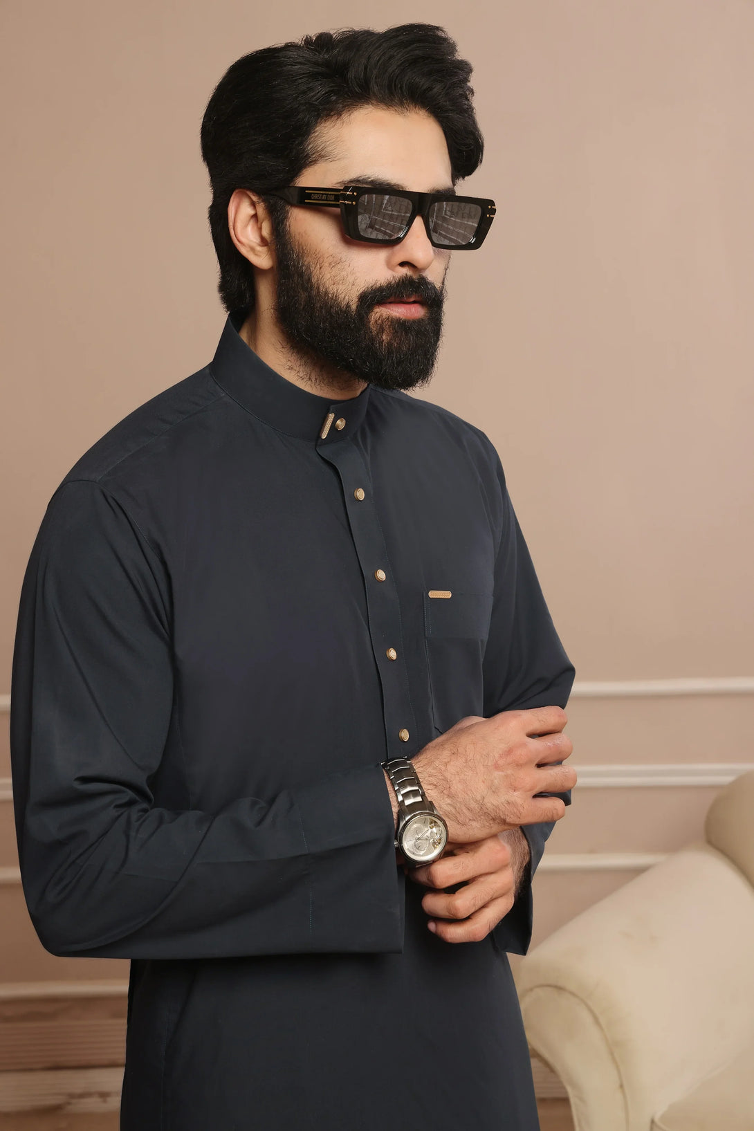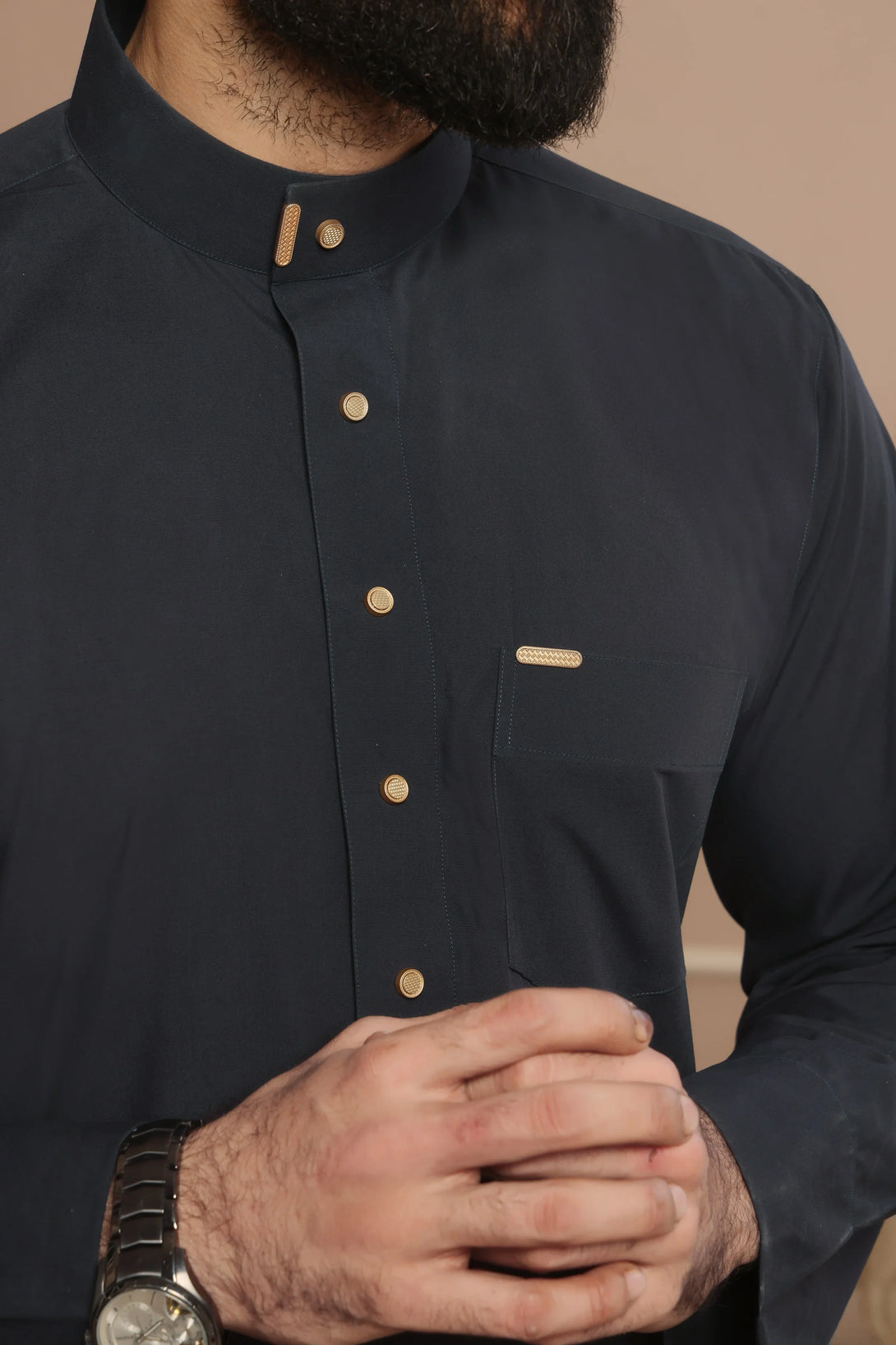 Experience refined sophistication with our Charcoal Round Collar Thobe. Crafted from Premium Wash & Wear Suiting fabric. It features a classic round collar, elegant hems, and impeccable stitching. A timeless symbol of elegance and class.