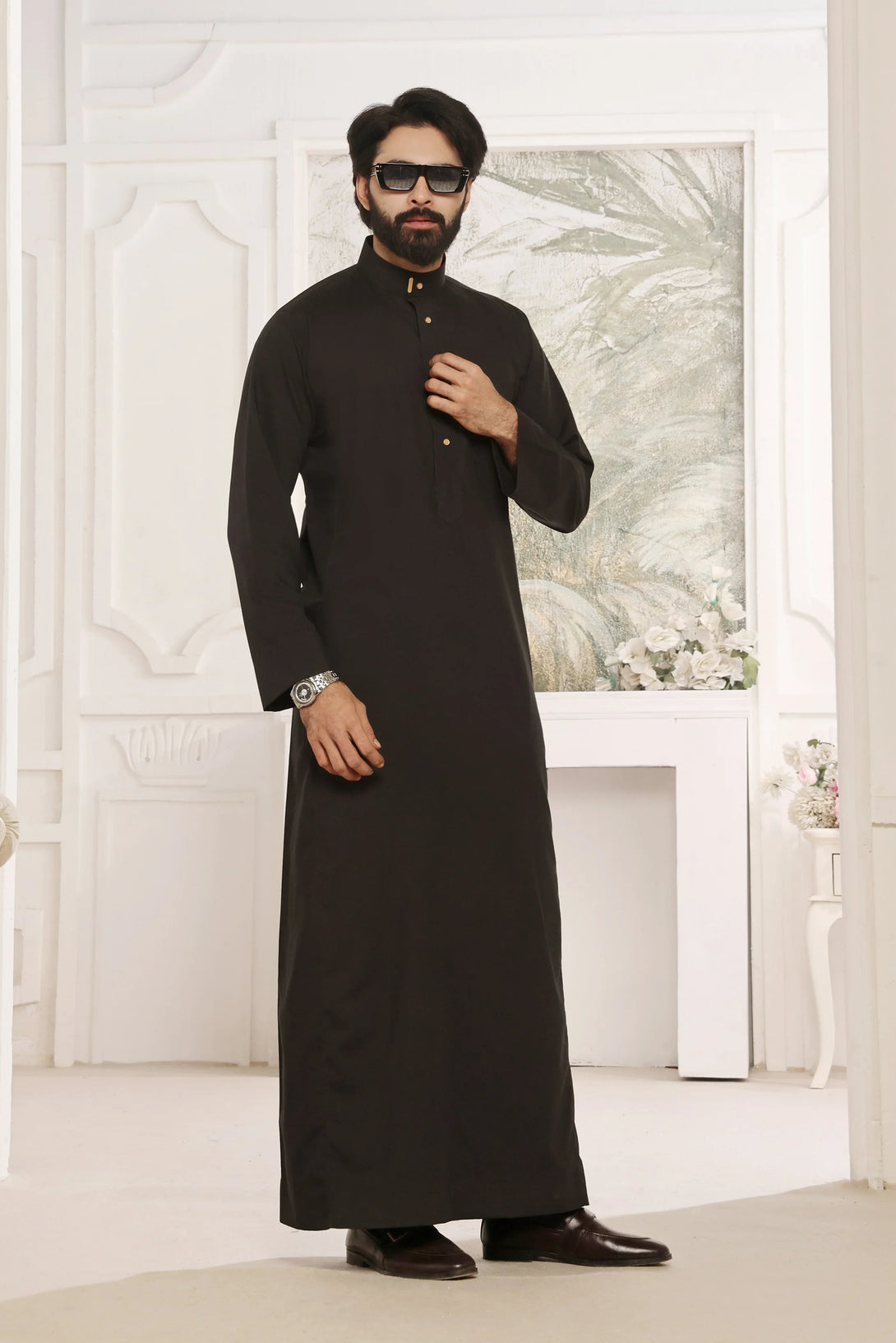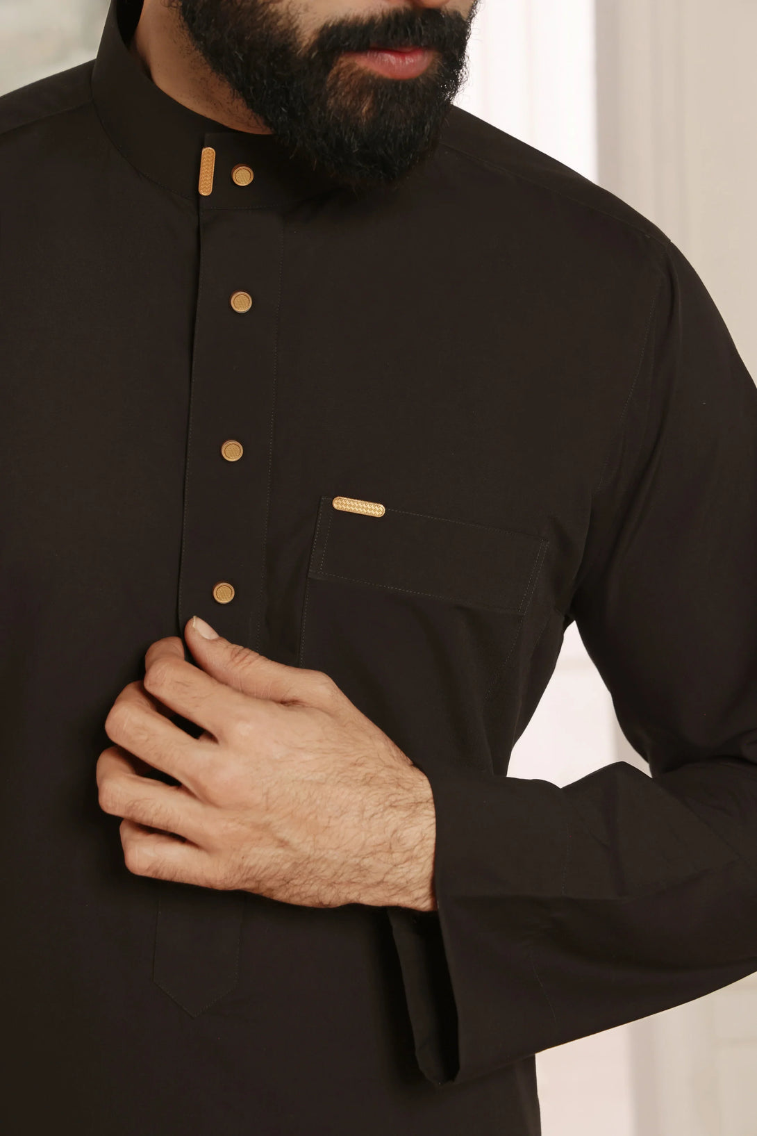 Experience refined sophistication with our Dark Chocolate Round Collar Thobe. Crafted from Premium Wash & Wear Suiting fabric. It features a classic round collar, elegant hems, and impeccable stitching. A timeless symbol of elegance and class.
