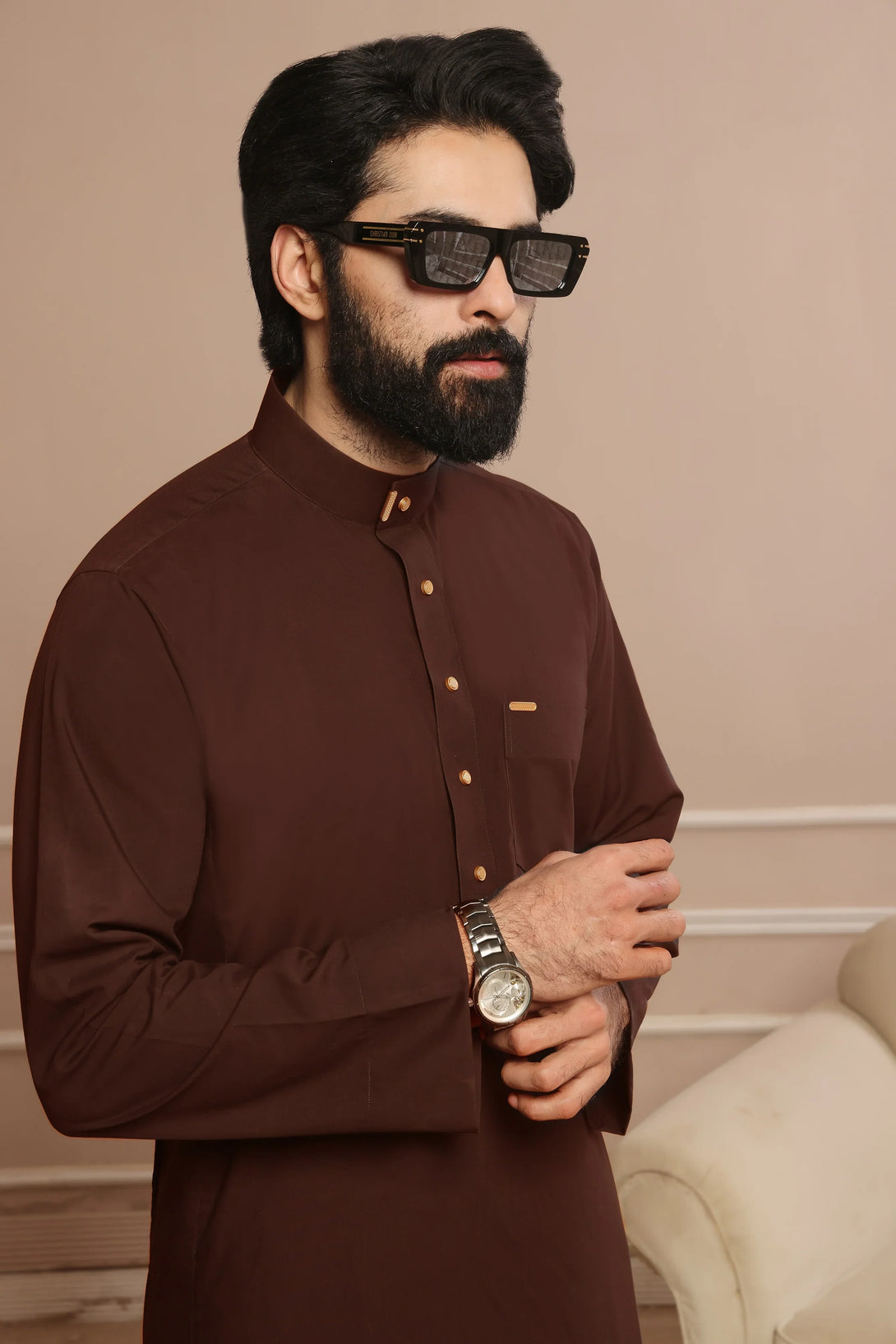 Experience refined sophistication with our Rust Round Collar Thobe. Crafted from Premium Wash & Wear Suiting fabric. It features a classic round collar, elegant hems, and impeccable stitching. A timeless symbol of elegance and class.