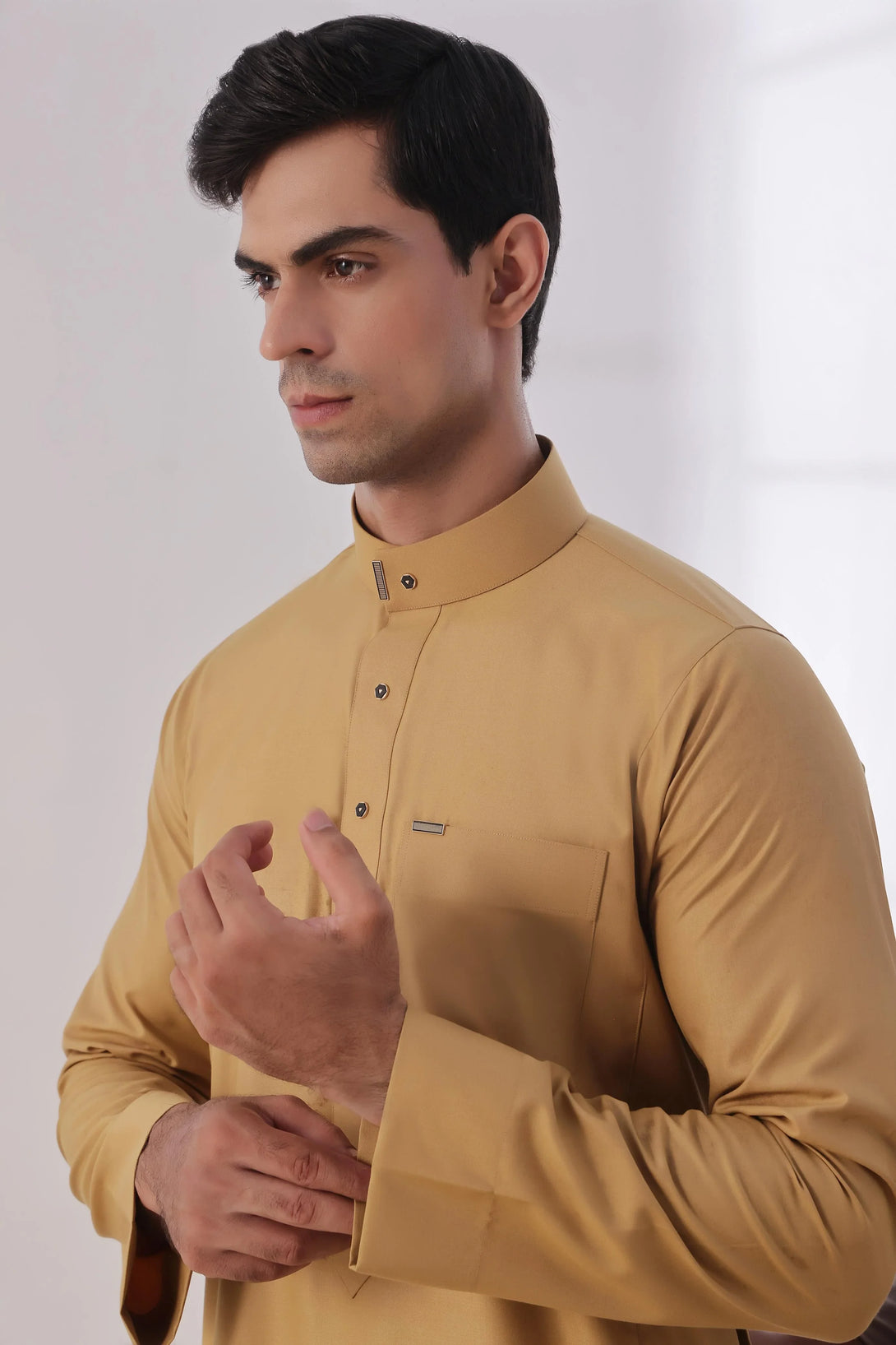 Experience refined sophistication with our Camel Fawn Round Collar Thobe. Crafted from Premium Wash & Wear Suiting fabric. It features a classic round collar, elegant hems, and impeccable stitching. A timeless symbol of elegance and class.