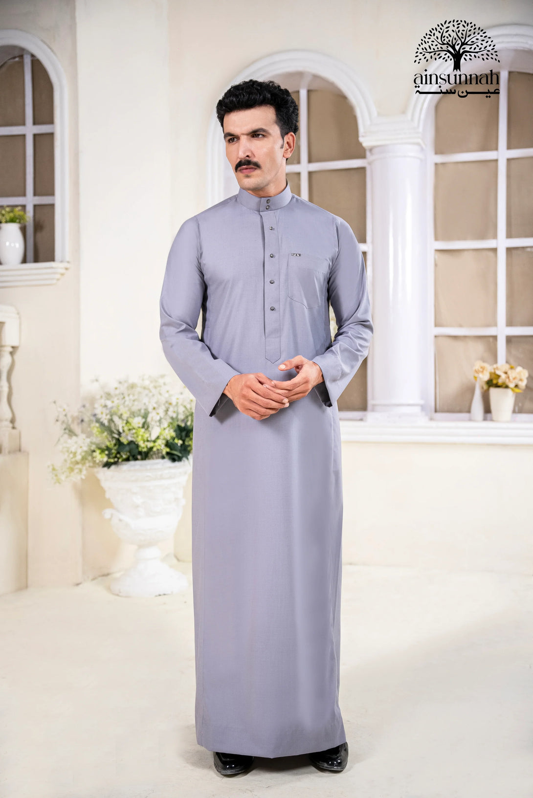 Silver Gray Saudi Collar Thobe - Round Collar with hems