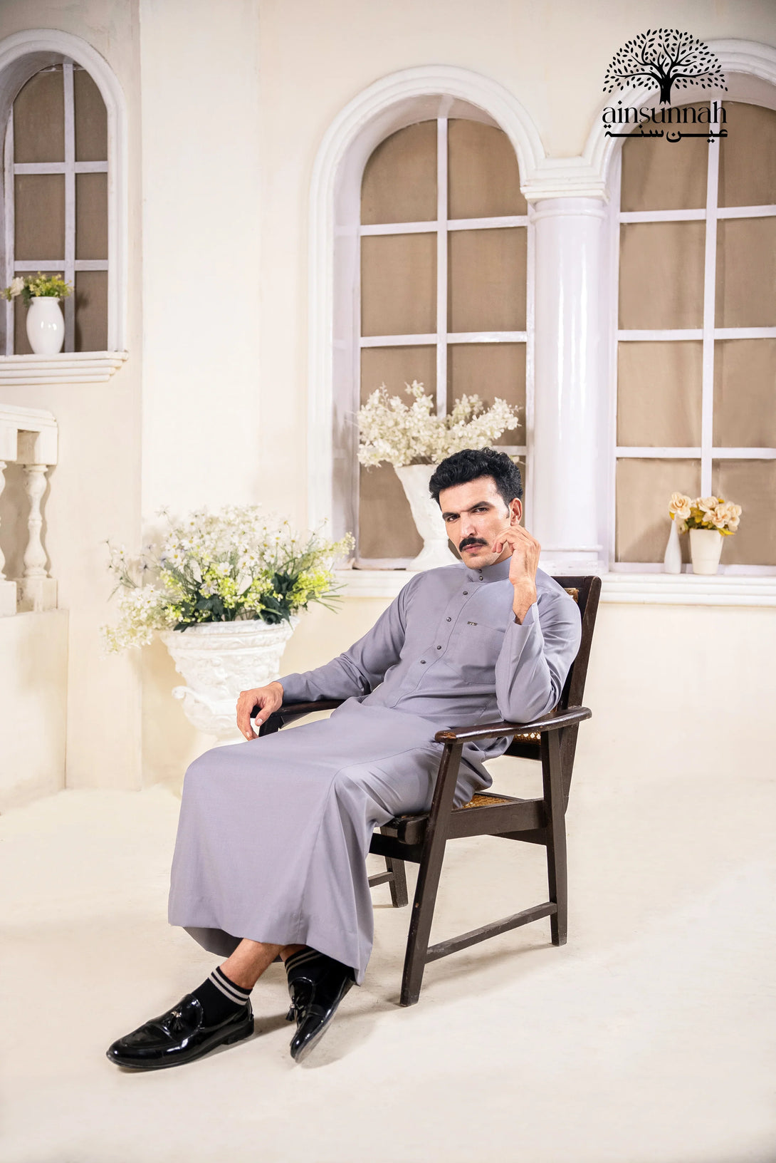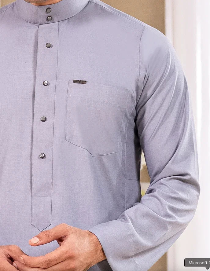 Experience refined sophistication with our Silver Gray Round Collar Thobe. Crafted from Premium Wash & Wear Suiting fabric. It features a classic round collar, elegant hems, and impeccable stitching. A timeless symbol of elegance and class.